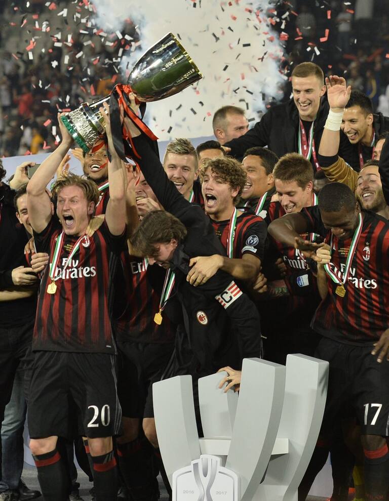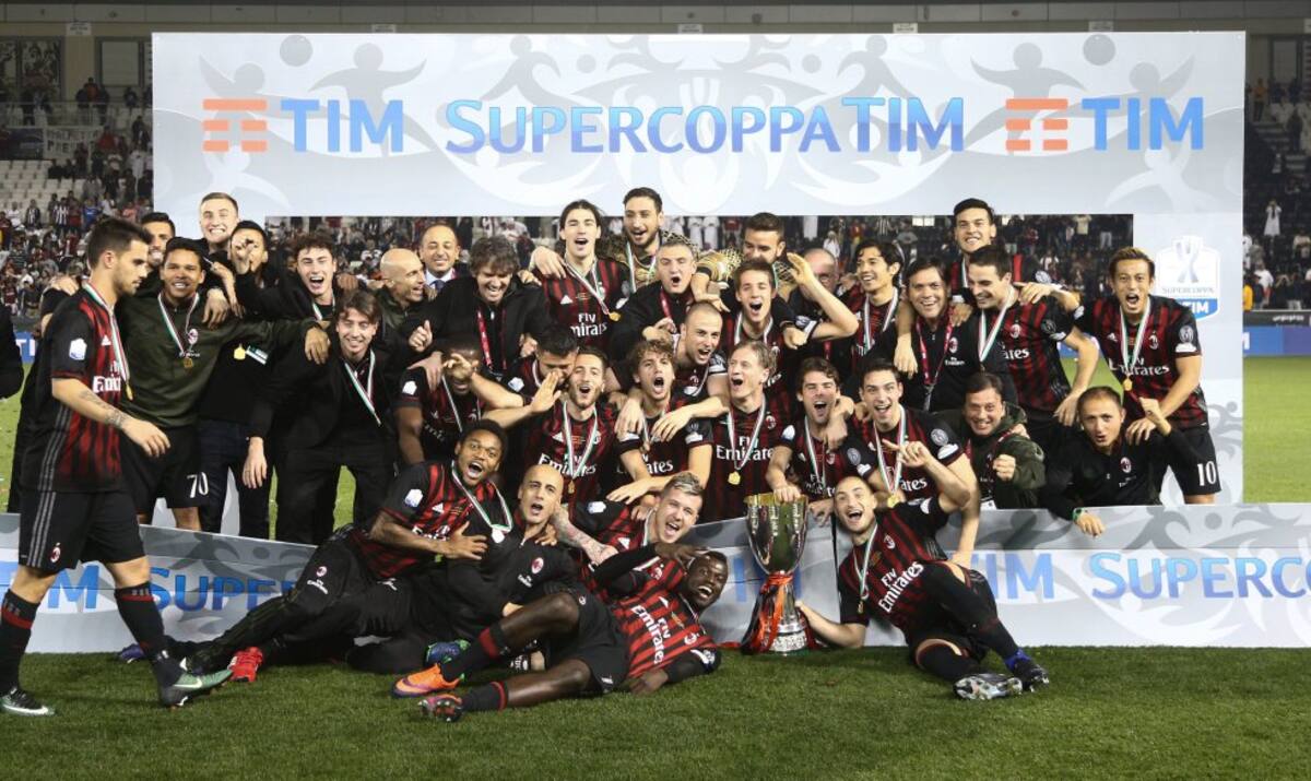 Los jugadores de Milan levantando el trofeo de campeones de la Supercopa Italia.