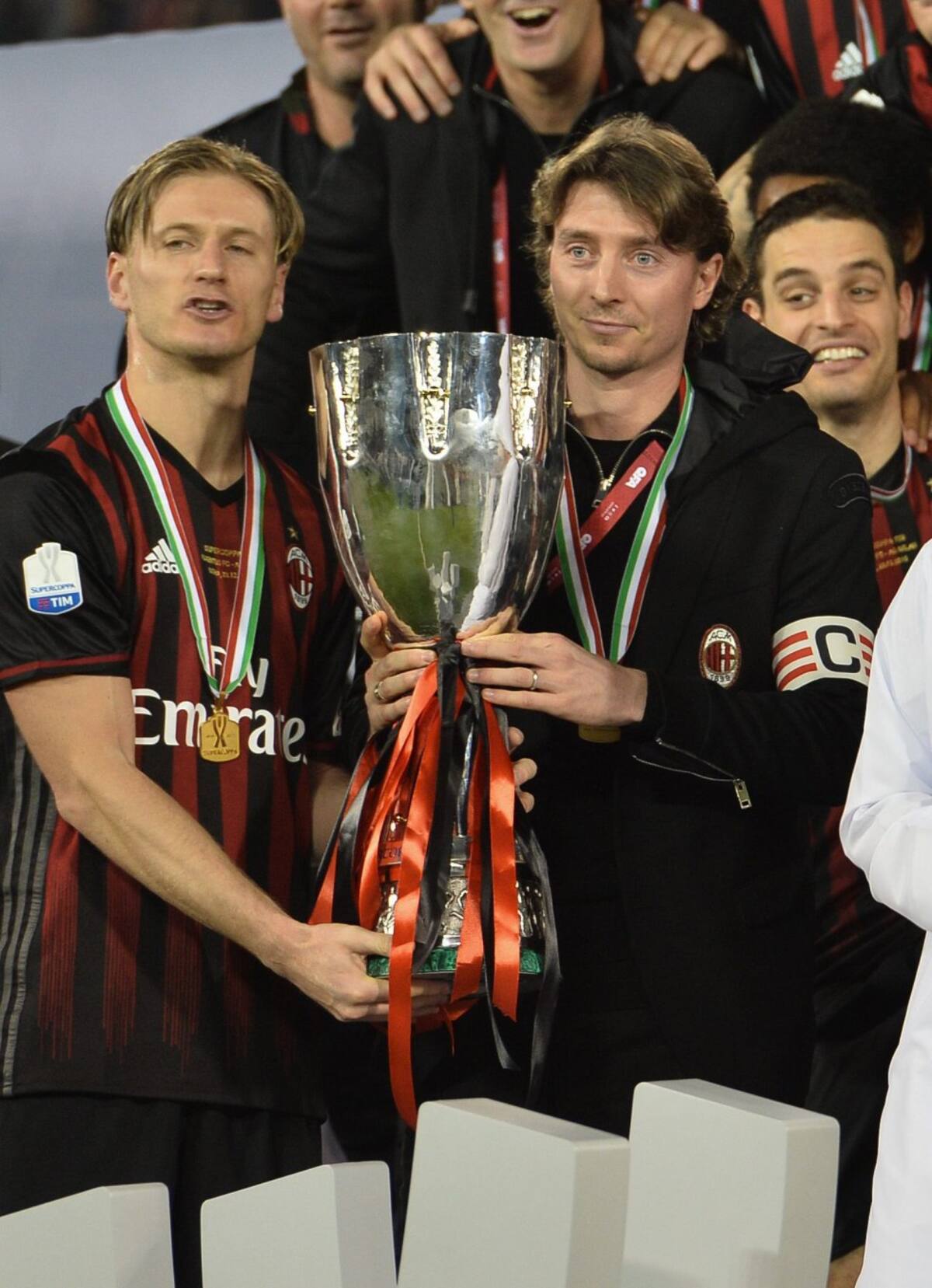Abate y Montolivo sosteniendo la copa.