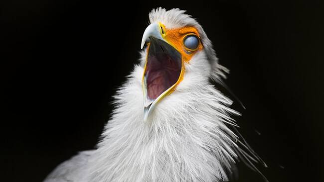 Foto 1 de 13Secretario, es la especie de este pájaro que pone los ojos blancos mientras grazna en el santuario de aves de Ciudad del Cabo.