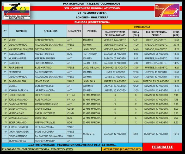 Desde este viernes 4 de agosto y hasta el próximo domingo 13 del mismo mes, 19 deportistas nacionales representarán al país en el Mundial de Atletismo. Prográmese con el calendario completo de nuestros atletas en Londres 2017.