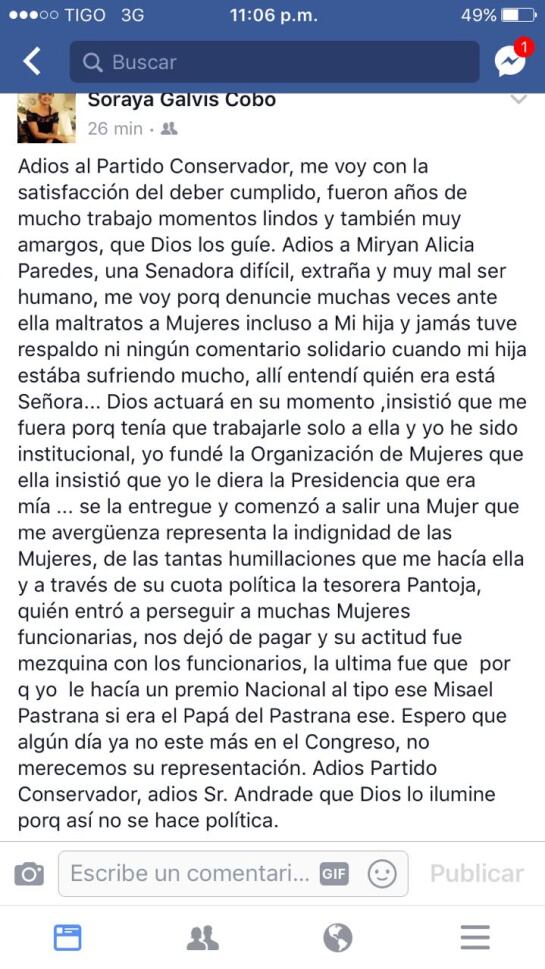 Soraya Galvis Cobo quien lideraba los temas de género en el partido escribió un mensaje en Facebook en el que relata episodios laborales incomodos en la colectividad con la senadora Miriam Paredes y el senador Hernán Andrade.