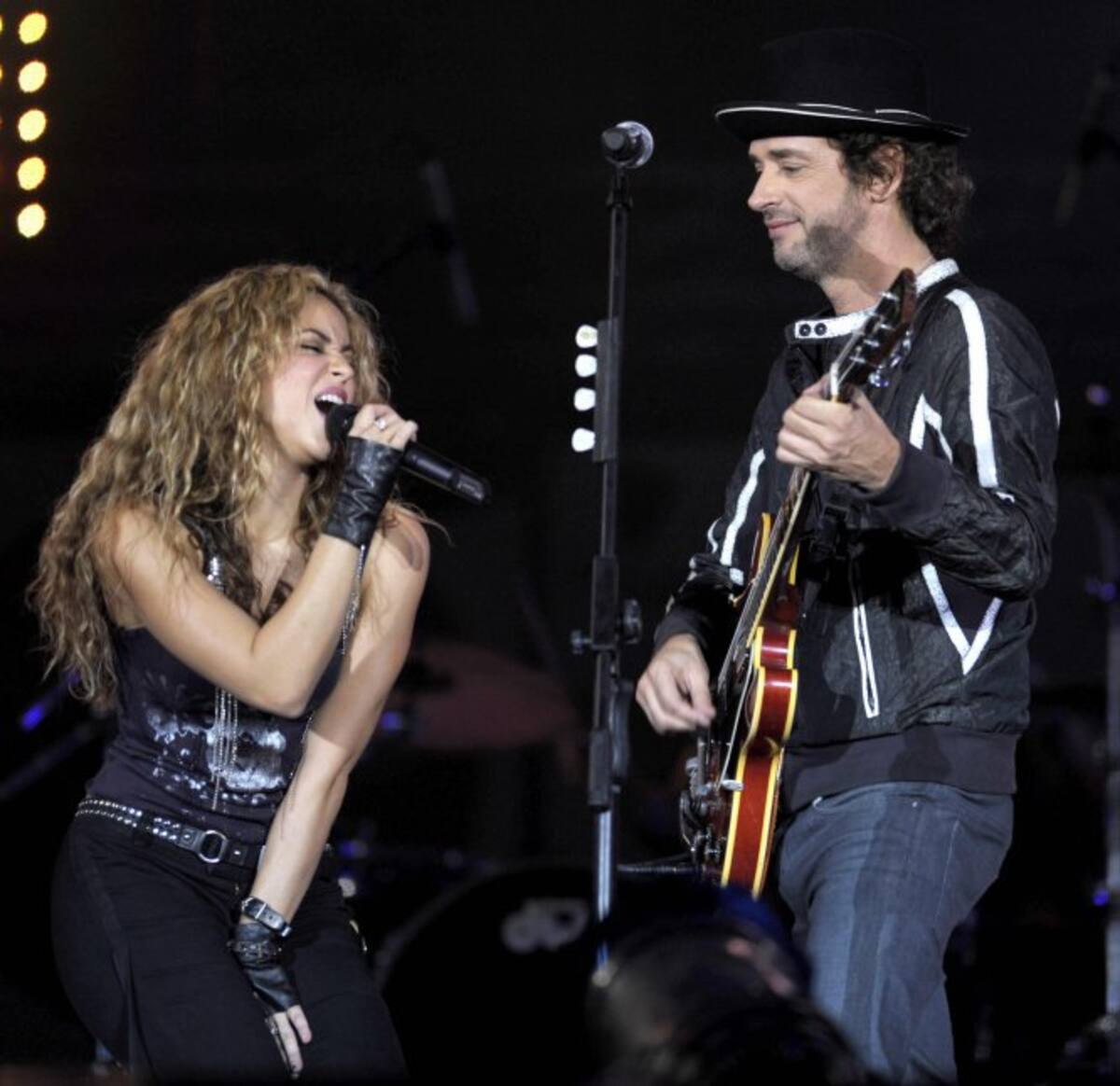 La cantante colombiana Shakira y el argentino Gustavo Cerati se presentan durante un concierto benéfico en Buenos Aires el 17 de mayo de 2008.