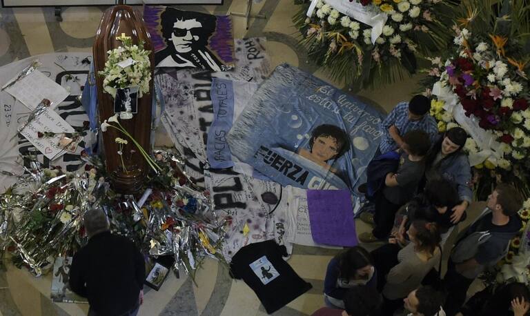 Familiares, amigos y fans se lamentan ante el ataúd del fallecido artista argentino Gustavo Cerati, en Buenos Aires el 5 de septiembre de 2014.