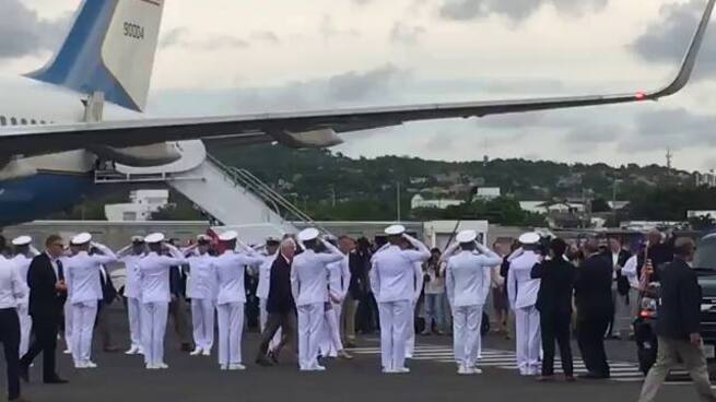 A las 3:36 de la nublada tarde de domingo en Cartagena, aterrizó en el aeropuerto internacional Rafael Núñez el Air Force Two, que traía a bordo al vicepresidente de los Estados Unidos de América, Mike Pence.