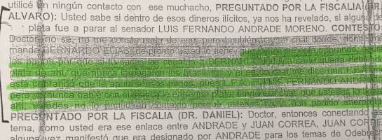 En cuanto a Luis Fernando Andrade, director de la ANI, dijo que tuvo en sus manos un chat que le adjunto el senador Elías, donde habla de alguna exigencia de dinero que estaría haciendo Andrade por las diligencias en la entidad, pero insiste que no conoció personalmente al funcionario.