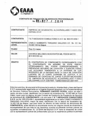 Tarquino también tuvo un contrato para asesorar a la empresa de acueducto del Espinal en el Tolima, curiosamente para sustentar proceso en casación que se adelantó en la Corte Suprema, donde Tarquino fue presidente, la sala laboral.