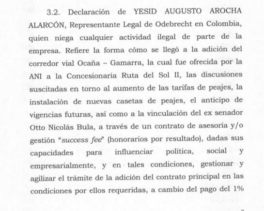 Contó que al exsenador Otto Nicolás Bula lo contrataron a través de un contrato de asesoría (honorarios por resultado) dadas sus capacidades para influenciar política, social y empresarialmente, y en tales condiciones agilizar el trámite de la adición del contrato, a cambio del pago del 1% de su valor, es decir una suma cercana a los 4.600 millones de dólares.