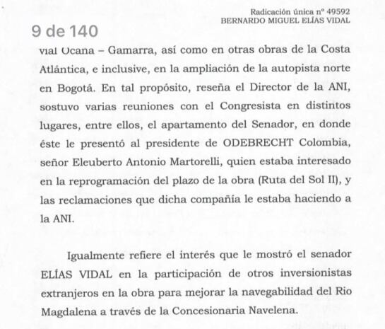 También, se refirió al interés de Elías en otras obras de la costa atlántica, inclusive en la ampliación de la autopista Norte en Bogotá. Según Andrade, sostuvo varias reuniones con el congresista en distintos lugares, entre ellos, su apartamento, donde Elías le presentó al presidente de la firma brasileña Eleuberto Martorelli y quien, al parecer, estaba interesado en la reprogramación del plazo de la obra Ruta del Sol II.