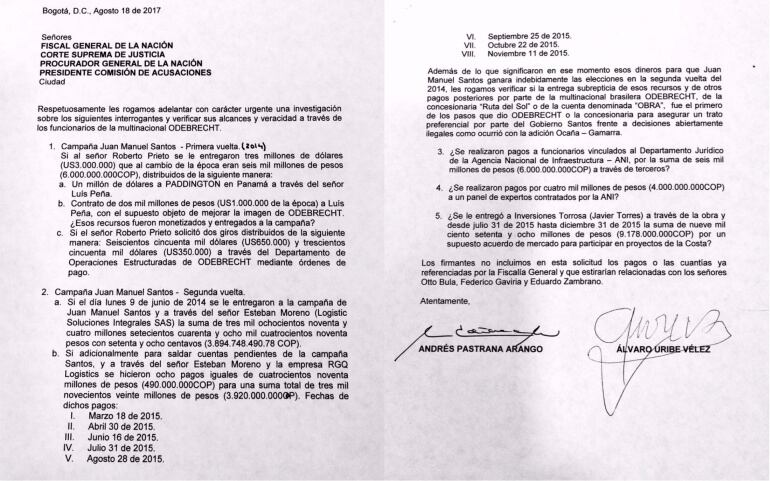 En un documento le piden a la Fiscalía, la Corte Suprema y la Comisión de Acusación que revise momentos específicos de la campaña en 2014 con montos de dinero que se habrían girado a través de Roberto Prieto y Luis Peña.