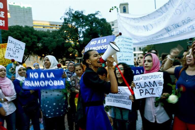 Mujeres islámicas durante la manifestación contra los atentados yihadistas.