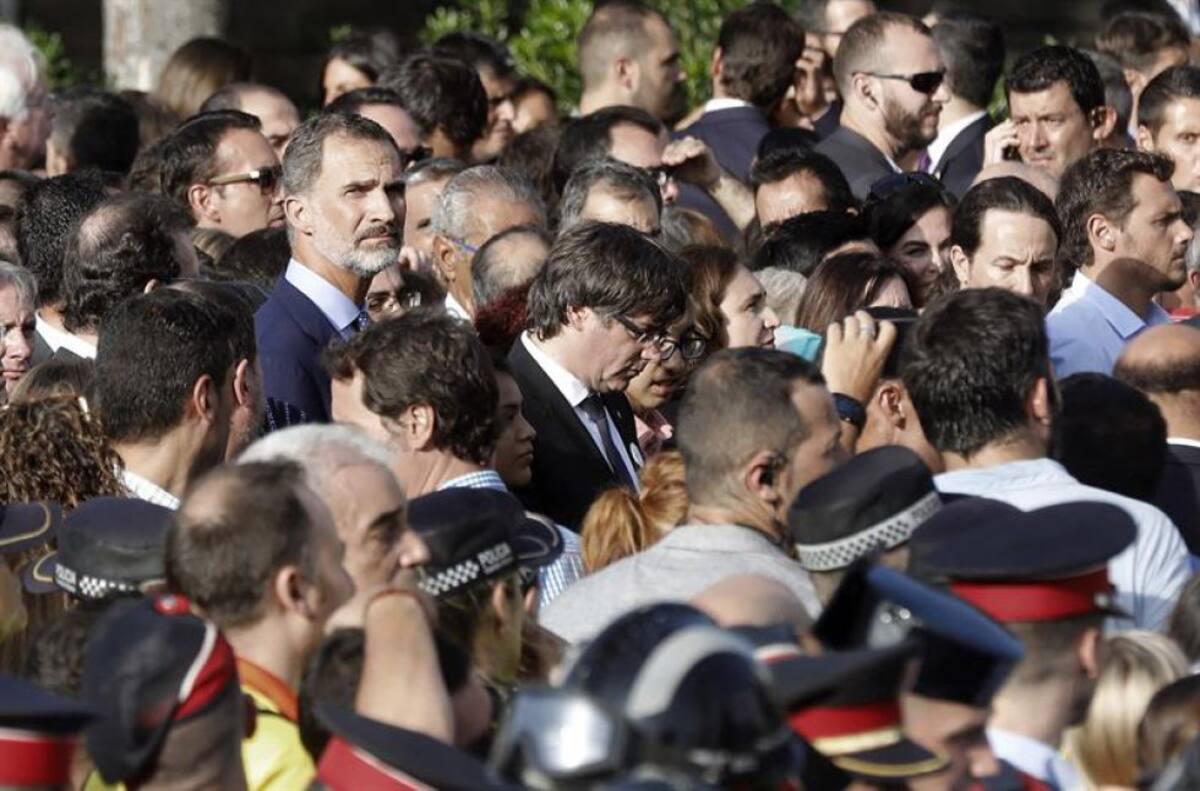 El rey Felipe VI y presidente catalán Carles Puigdemont, en la plaza Catalunya durante la manifestación.