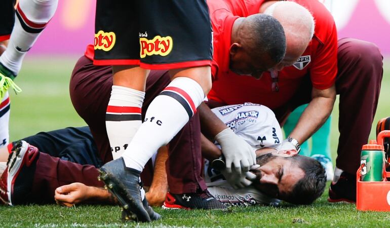Al minuto 21 del encuentro, en un rechazo de la defensa del Sao Paulo, un compañero de Pratto, de forma involuntaria, le dio un rodillazo al delantero que lo tumbó inmediatamente al campo.