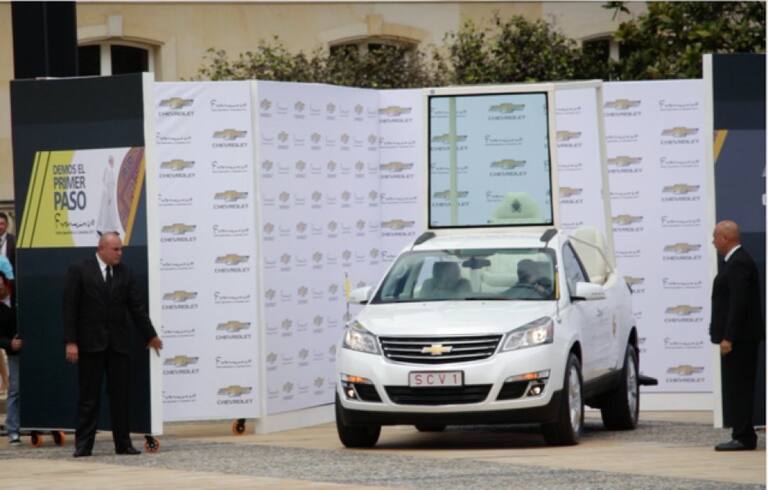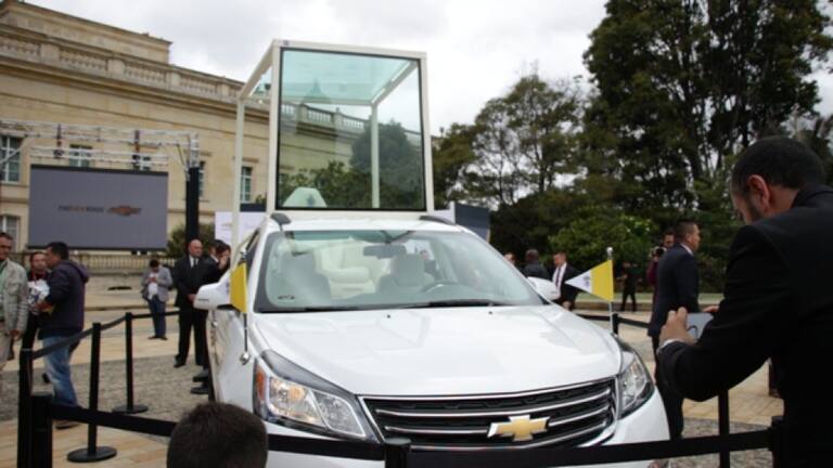 • En la Plaza de Armas de la Casa de Nariño, en una ceremonia se presentó uno de los tres papamóviles que acompañarán en los recorridos por tierra al sumo pontífice´.