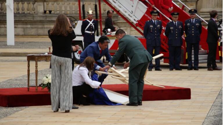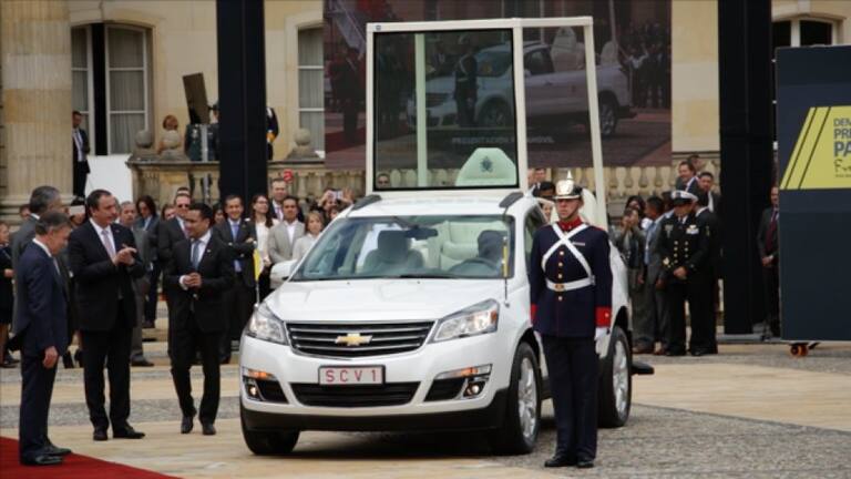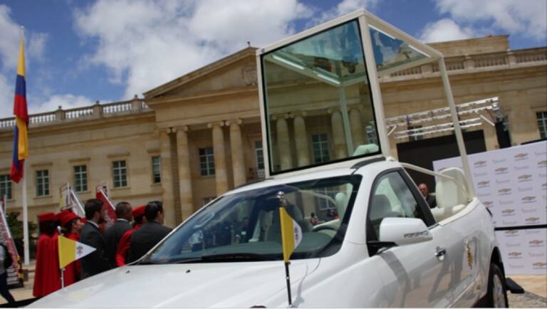 En la Plaza de Armas de la Casa de Nariño, en una ceremonia se presentó uno de los tres papamóviles que acompañarán en los recorridos por tierra al sumo pontífice