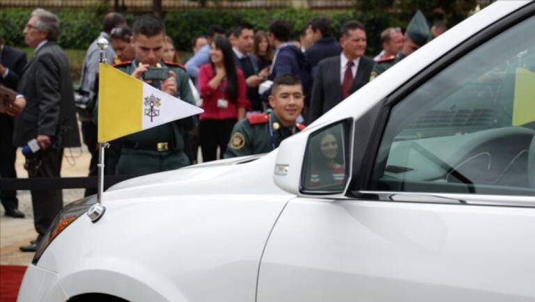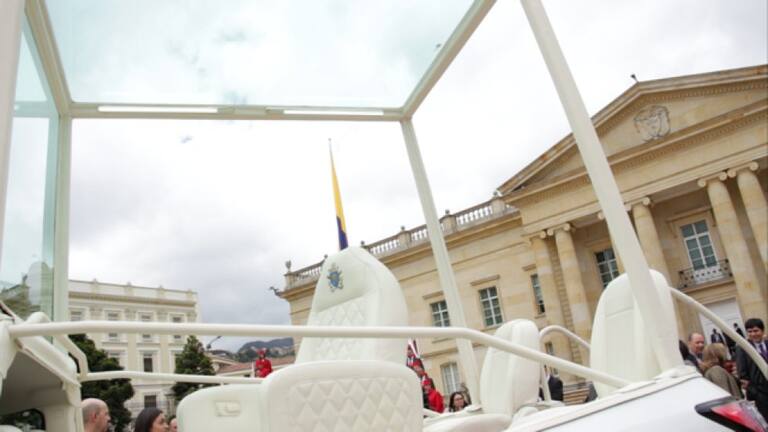 En la Plaza de Armas de la Casa de Nariño, en una ceremonia se presentó uno de los tres papamóviles que acompañarán en los recorridos por tierra al sumo pontífice.
