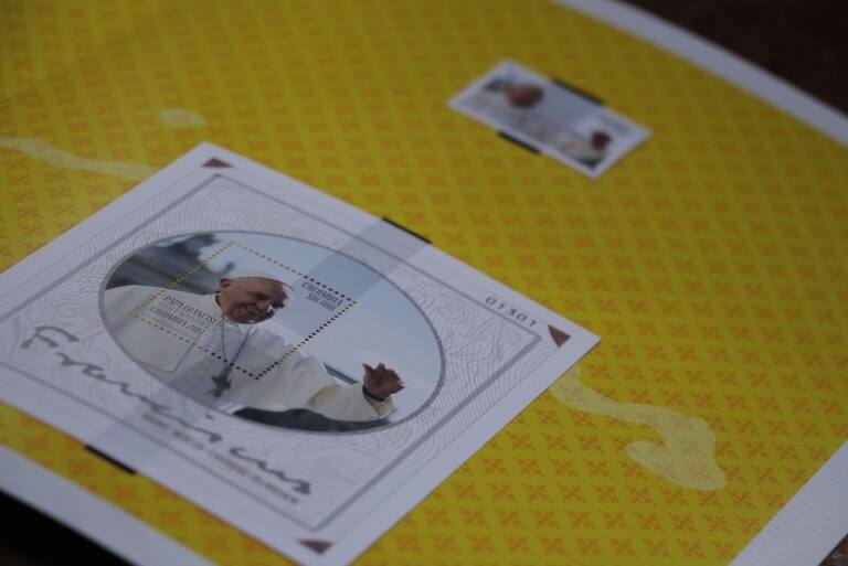 Al igual se presentó una estampilla conmemorativa, llena de color blanco y con el imagen de Santo Padre sonriendo.