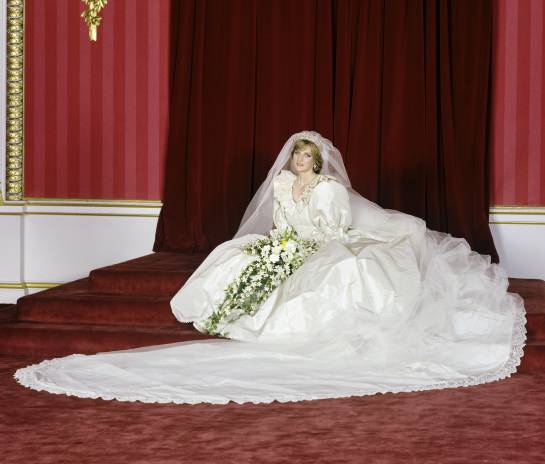 La boda de Diana con el príncipe Carlos en 1981 fue vista por cientos de millones de personas alrededor del mundo, y el vestido que usó para la ocasión fue lo más suntuoso posible. La creación de Elizabeth Emanuel en tafetán de seda con una cauda de 7,6 metros (25 pies) tenía unas románticas mangas globo, moños, encaje y 10.000 lentejuelas en color madreperla.