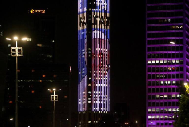 La imagen del papa Francisco es proyectada sobre la fachada de la Torre Colpatria