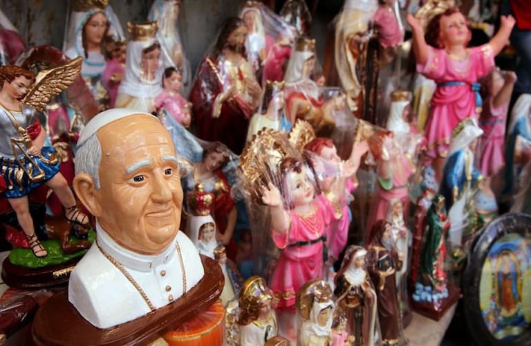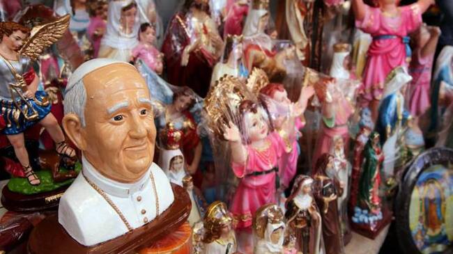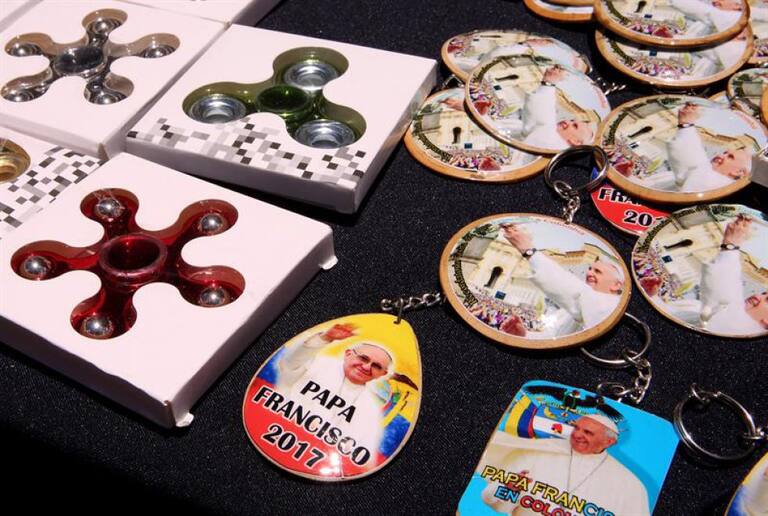 Productos del Papa Francisco en una venta callejera en la Iglesia Divino Niño del 20 de Julio en Bogotá