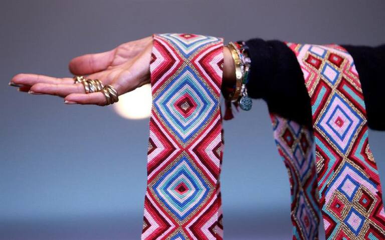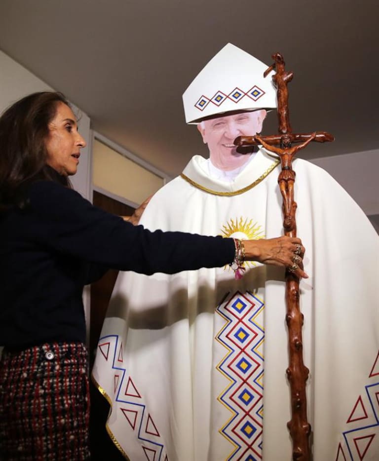 La diseñadora colombiana Pilar Castaño muestra la casulla y el báculo que utilizará el papa Francisco durante su visita a Colombia