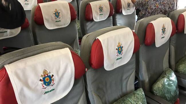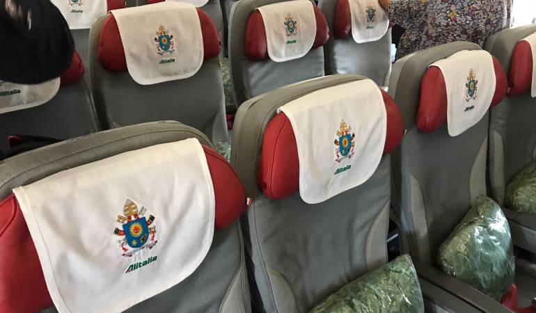 En el área donde están ubicados los periodistas, cada asiento tiene el nombre del periodista, el escudo del Vaticano y de la aerolínea Alitalia.