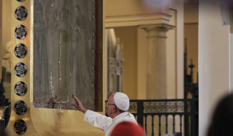 Luego de su encuentro con los jóvenes y el Presidente de la Republica en la plaza de Bolívar, El Papa Francisco oró ante la virgen de Chiquinquirá y pidió que guiara y cuidara a sus hijos colombianos.
