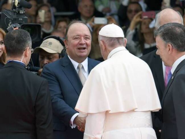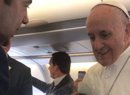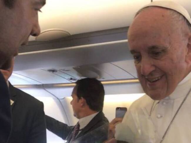 El periodista aprovechó el saludo del papa a la tripulación y periodistas, y le pidió un saludo a Colombia, a lo que Francisco respondió felicitando a la cadena radial más escuchada en Colombia por sus próximos 70 años
