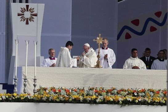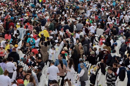 A pesar de la intensa lluvia que se registró en el parque Simón Bolívar en Bogotá, el papa Francisco durante la homilía de la Santa Misa, manifestó que el evangelista recuerda que el llamado de los primeros discípulos fue a orillas del lago de Genesaret, allí donde la gente se aglutinaba para escuchar una voz capaz de orientarles e iluminarles; y también es el lugar donde los pescadores cierran sus fatigosas jornadas, en las que buscan el sustento para llevar una vida sin penurias, digna y feliz. Es la única vez en todo el Evangelio de Lucas en que Jesús predica junto al llamado mar de Galilea. En el mar abierto se confunden la esperada fecundidad del trabajo con la frustración por la inutilidad de los esfuerzos vanos. Según una antigua lectura cristiana, el mar también representa la inmensidad donde conviven todos los pueblos. Finalmente, por su agitación y oscuridad, evoca todo aquello que amenaza la existencia humana y que tiene el poder de destruirla”.