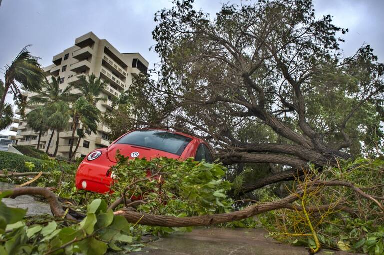 Árbol caído sobre un automóvil durante el paso del huracán Irma por Miami Beach, Florida
