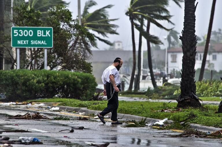 Hombre mientras camina junto a los escombros que han dejado los fuertes vientos durante el paso del huracán Irma por Miami Beach