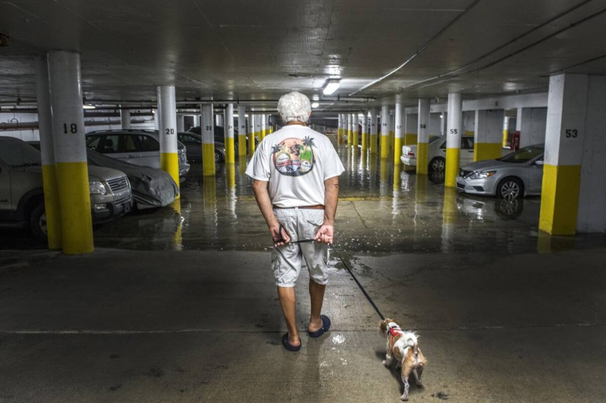 Reinaldo Jiménez mientras observa junto a su perro el interior del parking de su edificio durante el paso del huracán Irma en Collins Ave, en Miami Beach