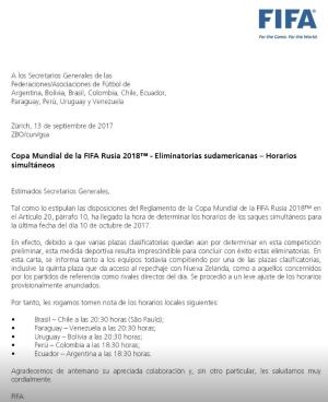 La FIFA emitió un comunicado dirigido a todos los Secretarios Generales de Federaciones de Fútbol de los países sudamericanos que integran la Conmebol, en el que se afirma que todos los partidos de la última fecha de las Eliminatorias Sudamericanas se jugarán a la misma hora.