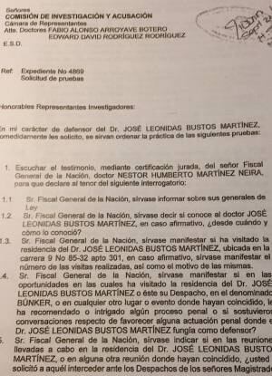Los representantes investigadores Fabio Arroyave y Edward Rodríguez, deberán resolver una solicitud que hizo la defensa del exmagistrado Leonidas Bustos, para citar a la Comisión de Acusación, al fiscal general Néstor Humberto Martínez, en calidad de testigo dentro del proceso que se adelanta por el escándalo de corrupción en la justicia.