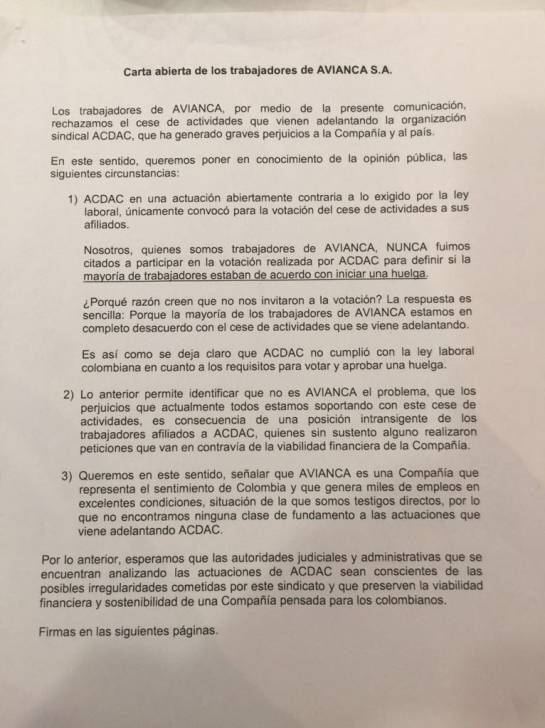 Más de 3.000 empleados de Avianca firmaron una carta que fue radicada en las últimas horas ante el Tribunal Judicial de Bogotá, en la que rechazan la huelga ilegal de los pilotos de Acdac.