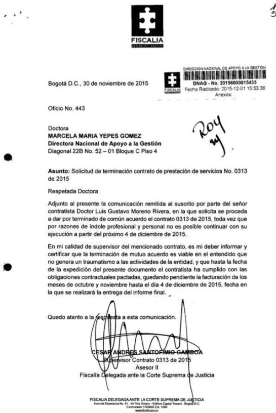 El contrato de Moreno como asesor externo de la Fiscalía fue firmado por seis meses: de junio a diciembre. Cada 30 días recibía más de 23 millones de pesos como honorarios, pero sólo el último mes el entonces fiscal Montealegre tomó la determinación de cancelarlo porque consideró que Moreno, como abogado, adelantaba casos ante la Fiscalía y eso podría generar alguna inhabilidad.
