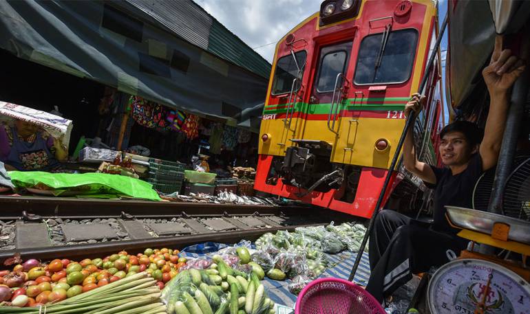 Y es que el llamado mercado Maeklong no solo te llamará la atención por la simpatía de sus comerciantes o el sinfín de productos frescos que ahí se pueden encontrar si los compradores más avezados no se te han adelantado ya, sino que ante todo se destaca por el hecho de estar ubicado, literalmente, en los márgenes de una vía ferroviaria por la que pasan diariamente nada menos que seis trenes.