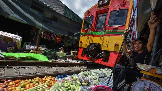Los comerciantes del llamado mercado Maeklong, ubicado en la provincia tailandesa de Samut Songkhram, tienen que desmontar sus puestos seis veces al día para no ser arrollados por los trenes.