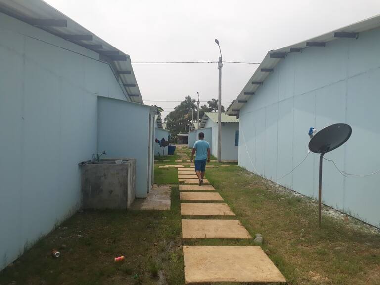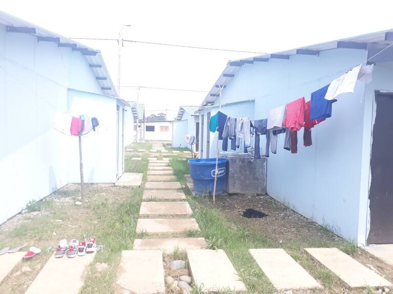 Los baños y duchas fueron ubicados al costado de cada una de las casas. Estos espacios tiene que ser compartidos mínimo por seis personas, que habitan los módulos habitacionales.