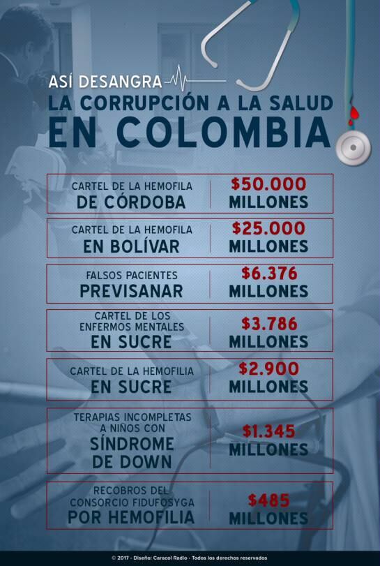 De acuerdo con el informe del organismo de control fiscal, el hecho más grave tiene que ver con los carteles de la hemofilia en los departamentos de Córdoba en donde se perdieron $ 50.000 millones y en Bolívar con $ 25.000 mil millones.