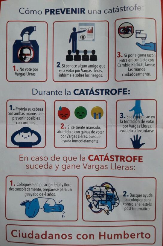El volante, que fue entregado por un grupo de jóvenes, también tenía instrucciones de cómo lavarse las manos después de saludar a un integrante de Cambio Radical o pedir ayuda profesional si está sintiendo ganas de votar por Vargas Lleras.