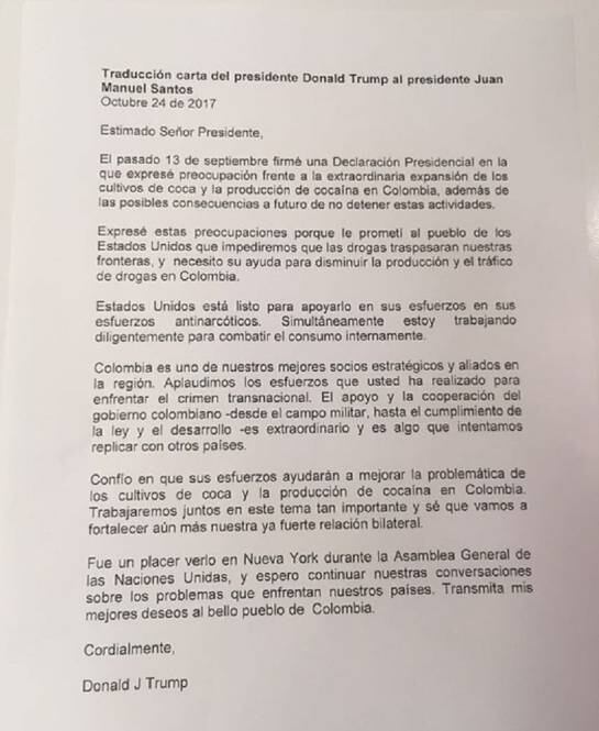 El presidente Juan Manuel Santos confirmó que el mandatario estadounidense le envió una carta en la que reconoce el trabajo