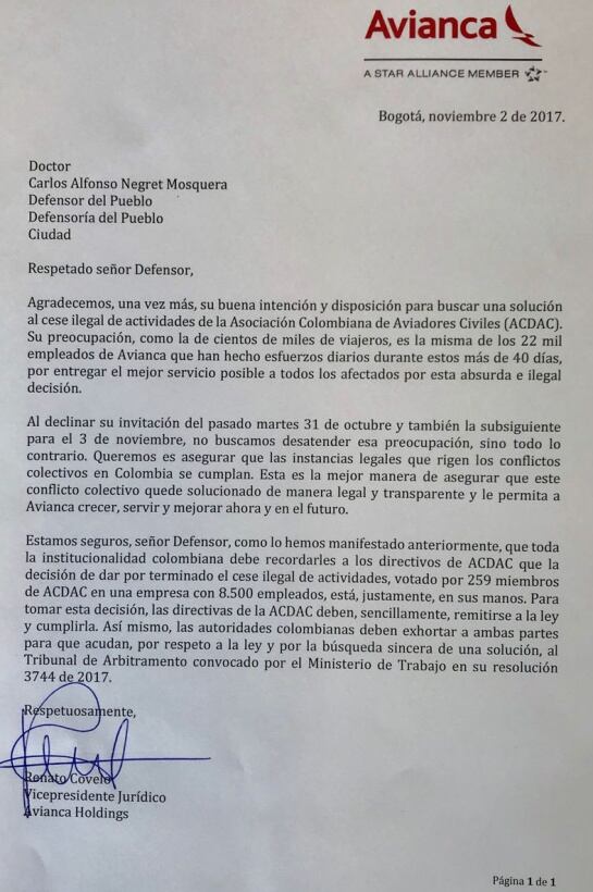 En una misiva enviada este jueves al defensor del Pueblo por el vicepresidente Jurídico de Avianca, le agradeció sus buenos oficios para buscar una salida a la huelga que cumple más de 40 días en el país.