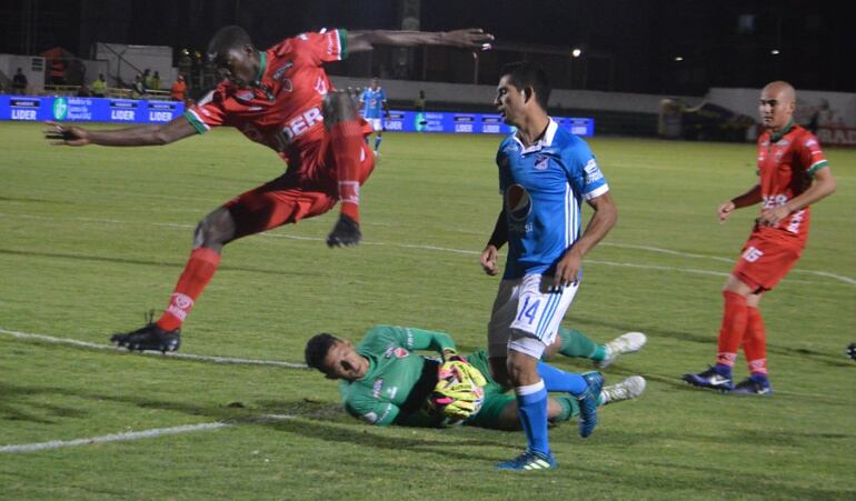 Álvaro Villete no entró con buena fortuna y se vio quedado a los 51 minutos en el empate de Millonarios. El meta uruguayo no midió bien un tiro de esquina, quedando a mitad de camino, viéndose sorprendido por Ayron del Valle que amplió su racha goleadora, sumando ya siete anotaciones en igual número de encuentros.