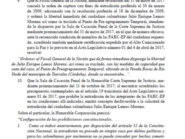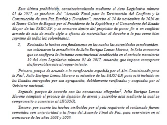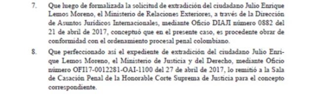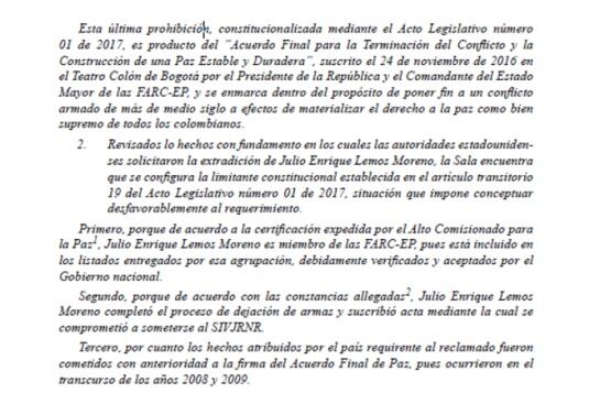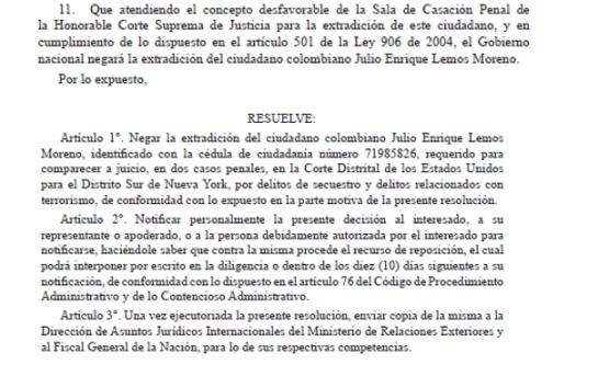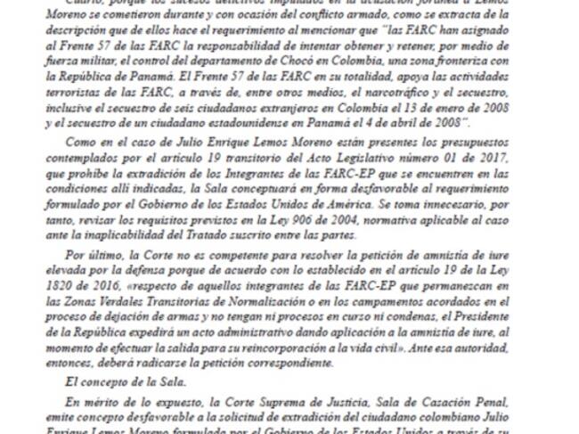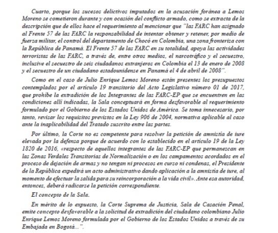 La Corte emitió un concepto desfavorable a la extradición, tras considerar que Náder se acogió al proceso de paz y por tanto será la Jurisdicción Especial quien lo investigue y condene, pero estaba pendiente la decisión del Gobierno.