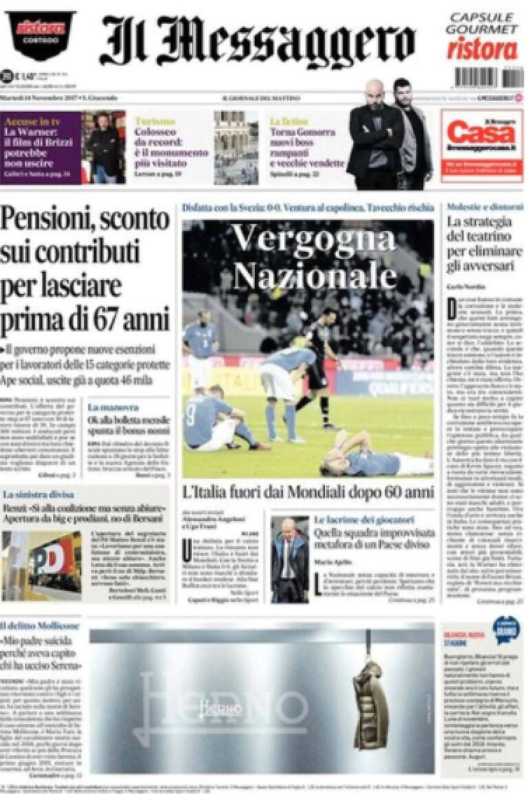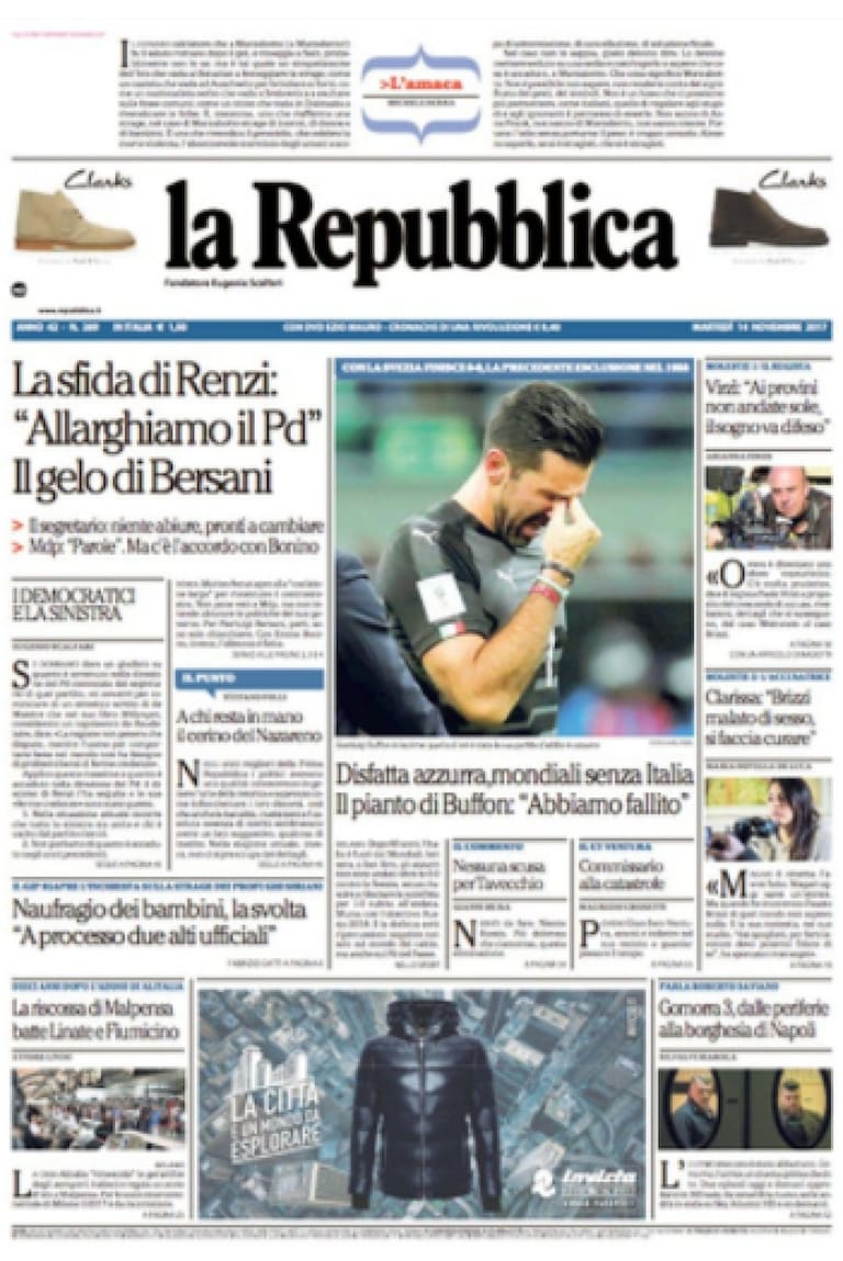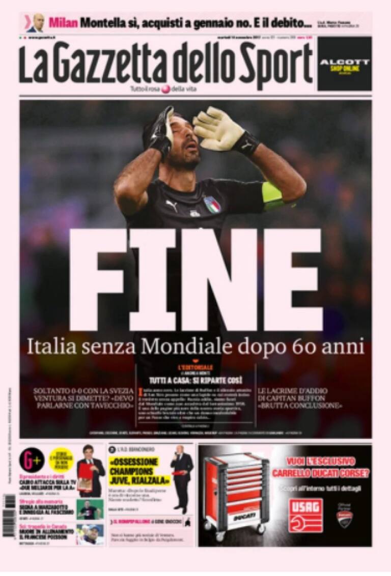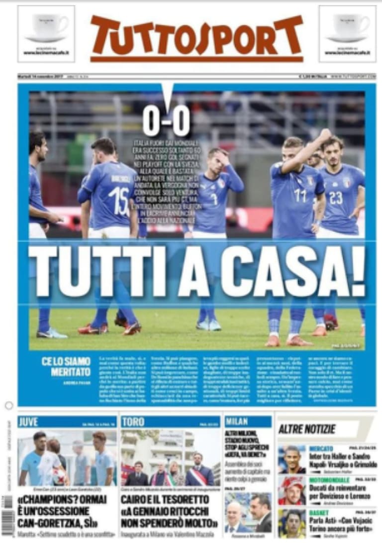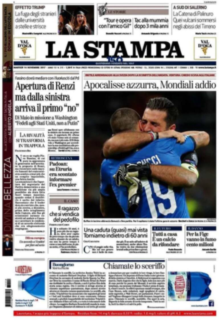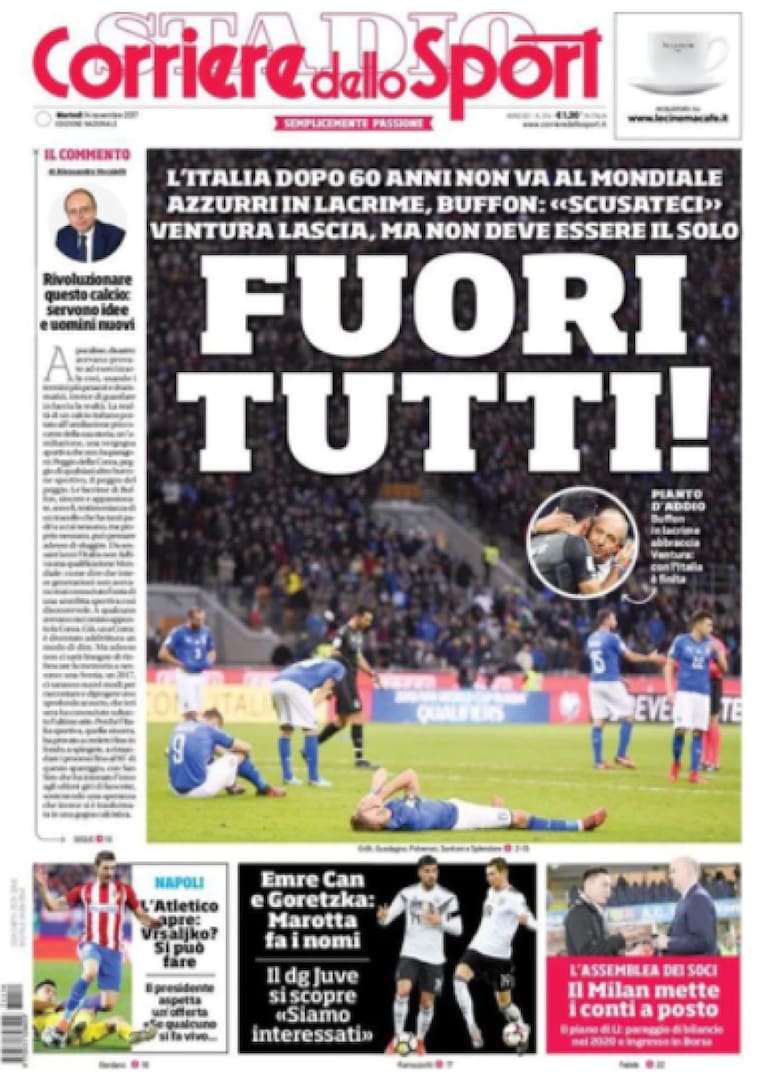 • "Derrota azzurra, Mundial sin Italia. El llanto de Buffon: 'Fracasamos'.