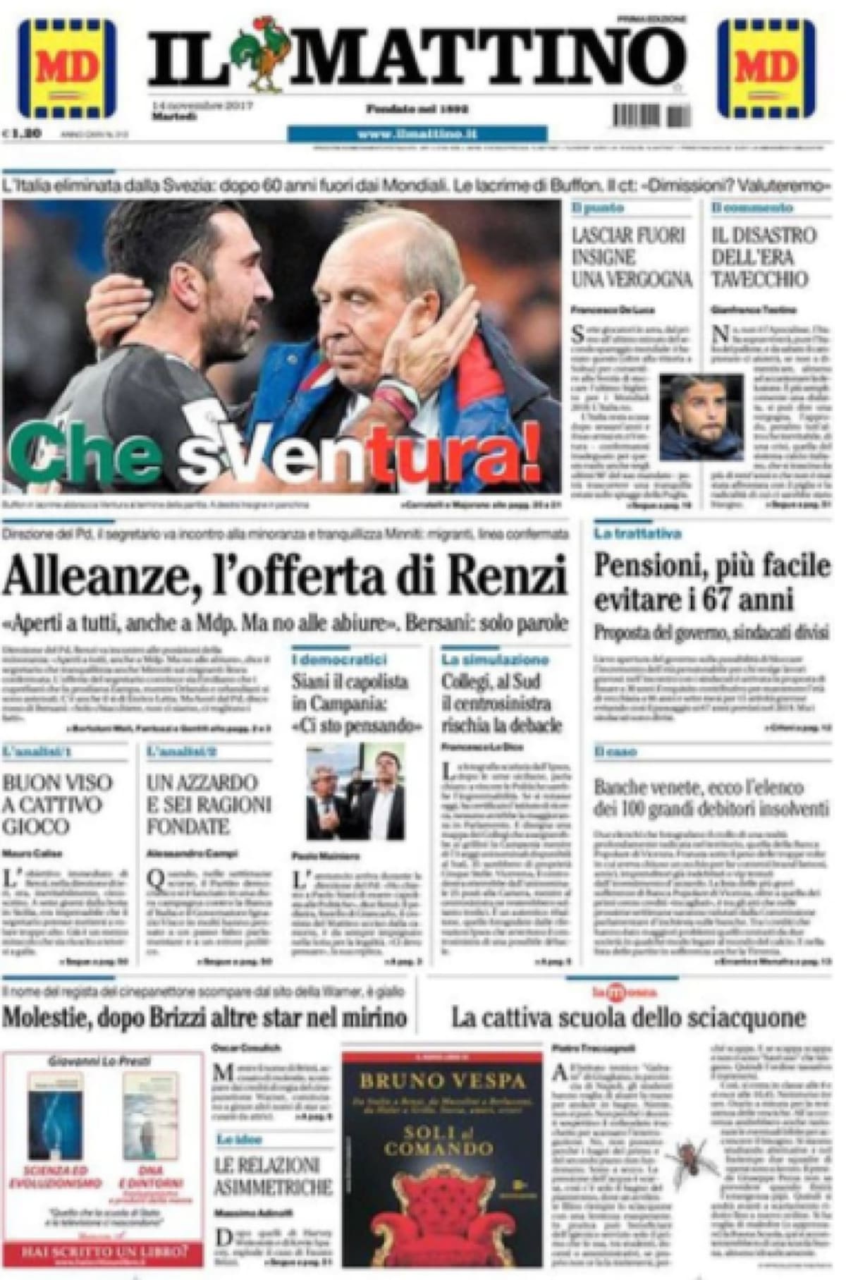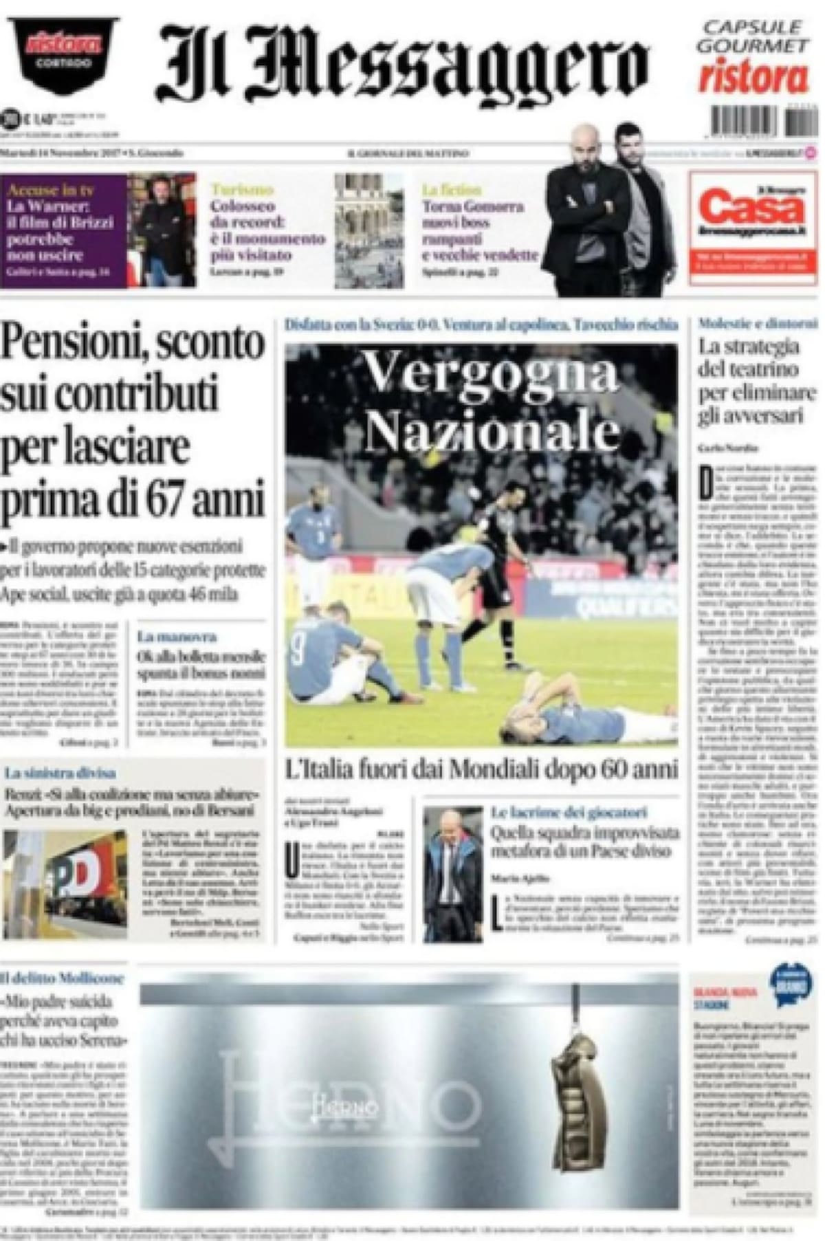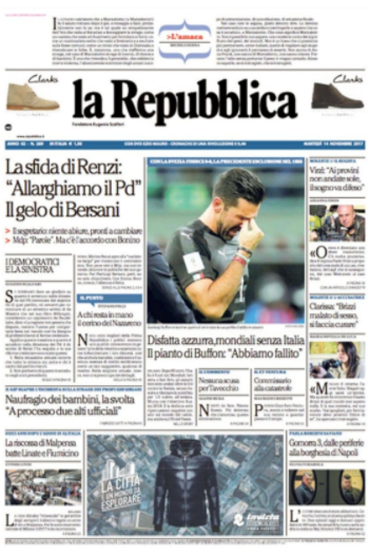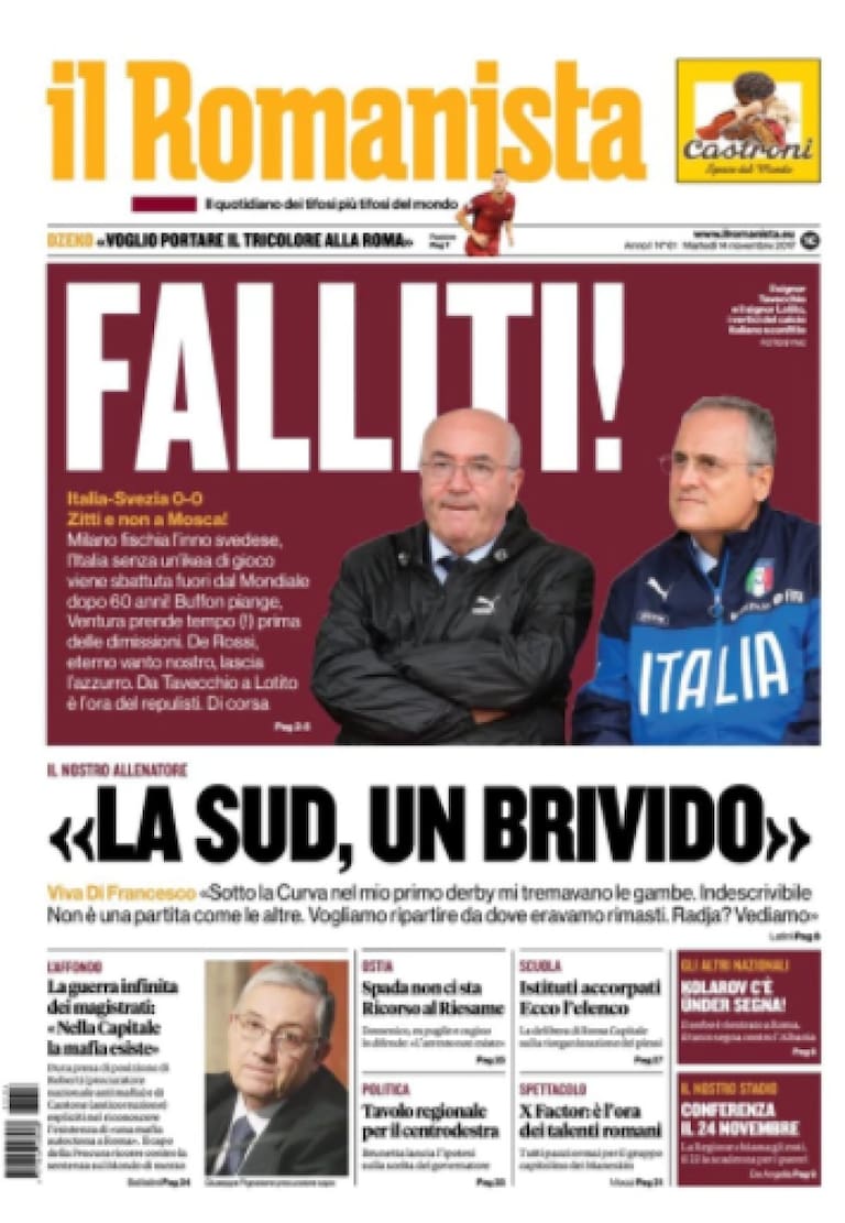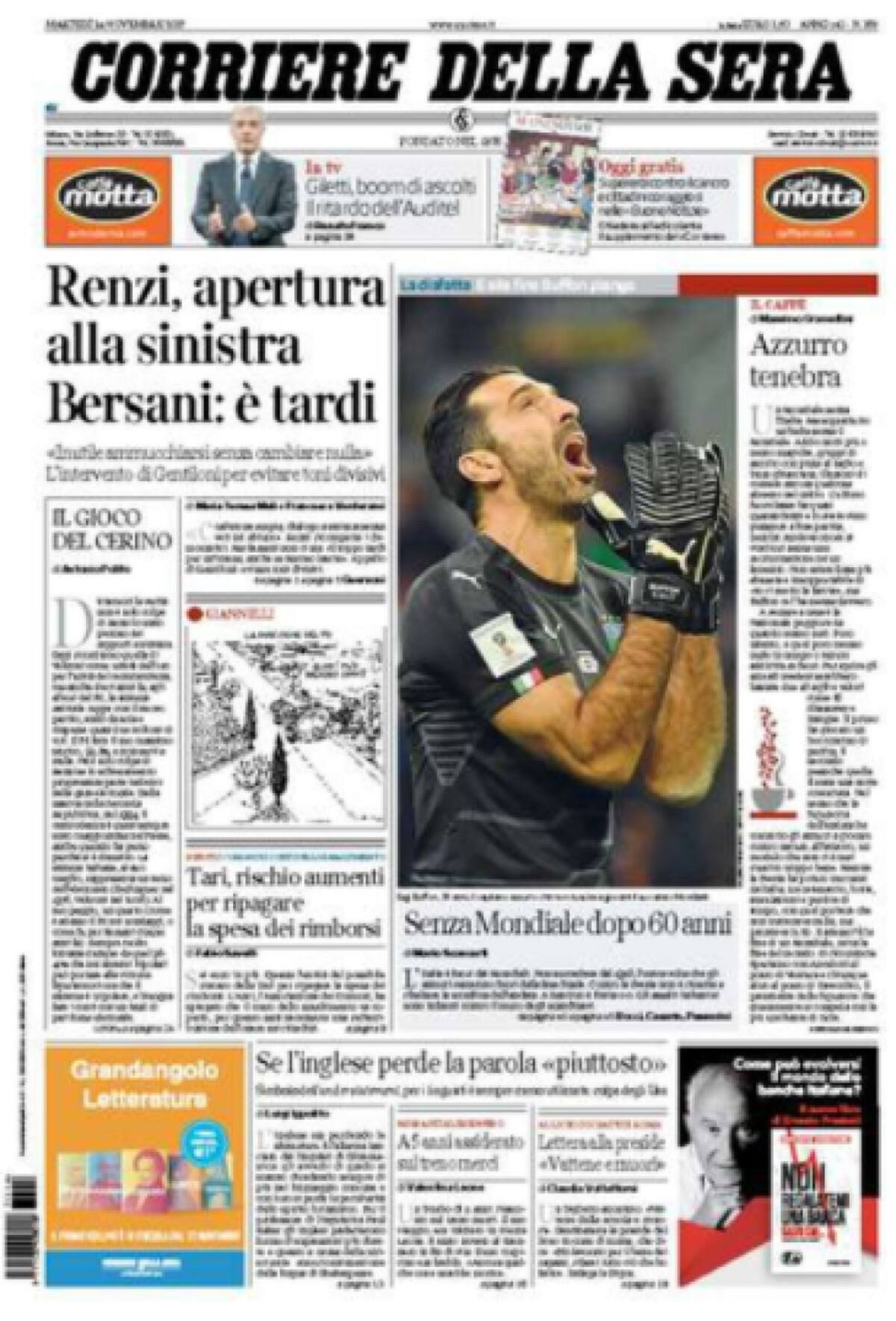 • "Derrota azzurra, Mundial sin Italia. El llanto de Buffon: 'Fracasamos'.
