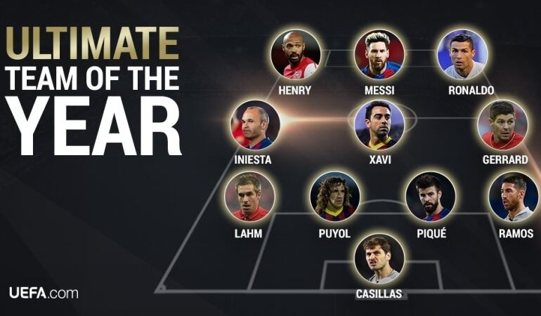 El equipo, lo conforman: Casillas; Sergio Ramos, Piqué, Puyol, Lahm; Xavi, Iniesta, Gerrard; Henry, Cristiano Ronaldo y Messi.