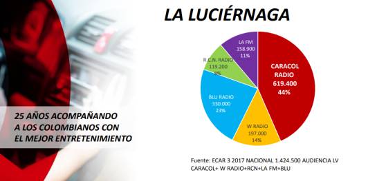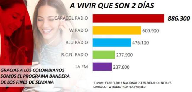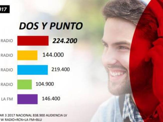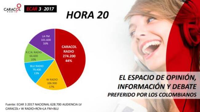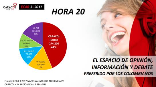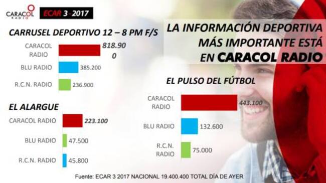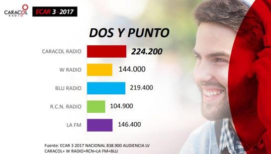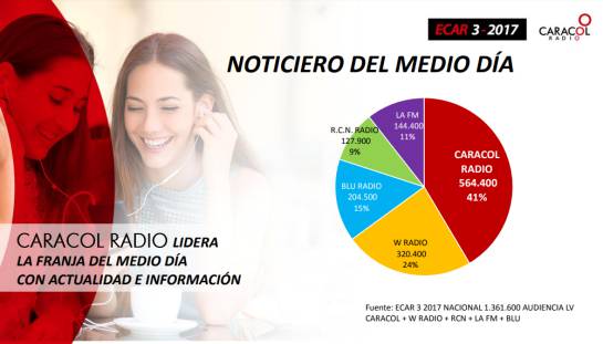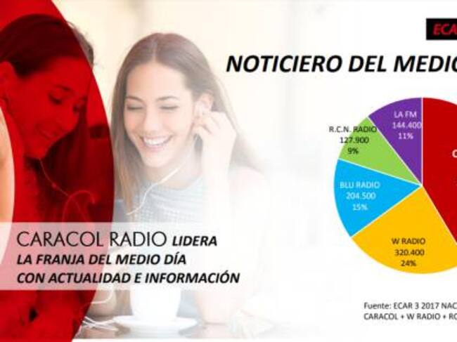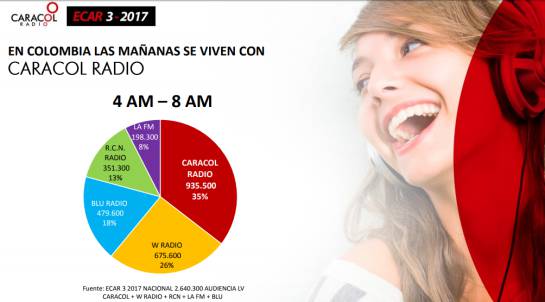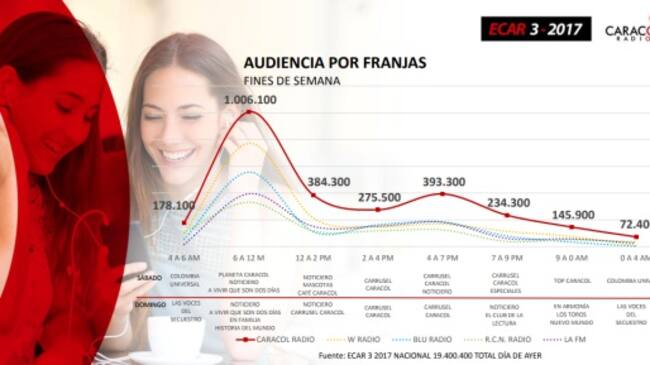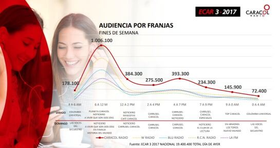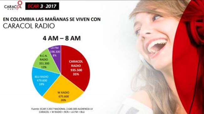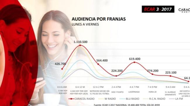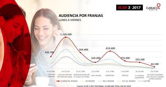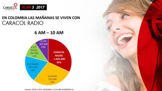 En la franja de 6:00 a. m. a 10:00 a. m. , Caracol Radio obtiene el primer lugar con 1.026.000 oyentes.