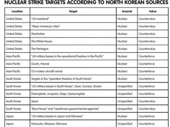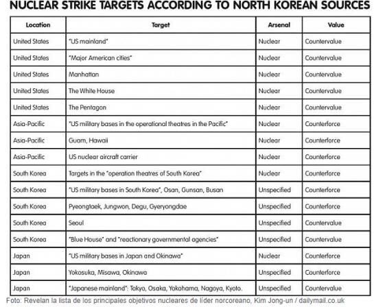 Este jueves el diario británico, Dailymail, dio a conocer la lista de objetivos nucleares de Kim Jong-un, en la cual se incluyen importantes lugares y ciudades de países como Estados Unidos, Corea del Sur, Japón y Asía Pacífico.