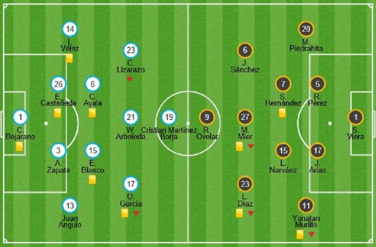 América: Carlos Bejarano; Juan Camilo Angulo, Eder Castañeda, Anderson Zapata, Iván Vélez; Camilo Ayala, Elkin Blanco, William Arboleda, Carlos Lizarazo (Eisner Loboa 70 min), Olmes García (Bryan Angulo 60 min) y Cristian Martínez Borja.